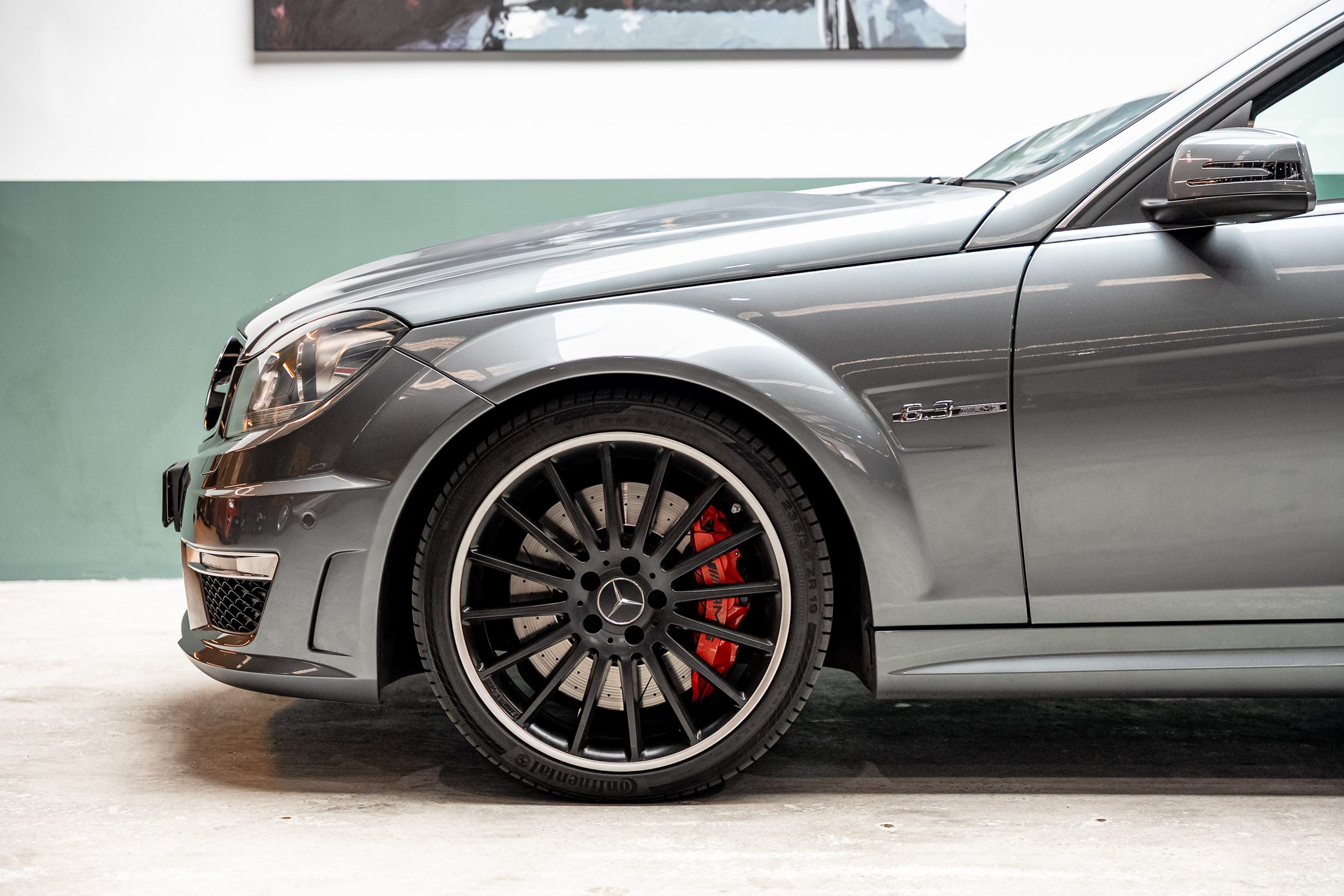 Finished in the rare and highly attractive Alabandite Grey (paint code 779), the colour perfectly suits the C63’s muscular yet understated design. The look is completed by the correct 19-inch AMG multi-spoke wheels, giving the car a strong, factory-correct stance.